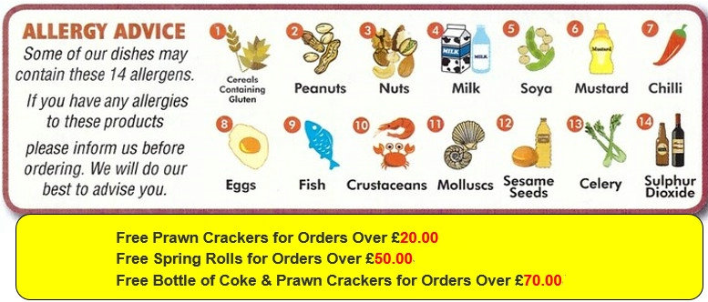 Chicken and sweet corn "4 (contain egg) BBQ Spare ribs, Crispy spring rolls, Fillet steak in cantonese style Roast duck with green pepper in black bean sauce, King prawn with ginger & spring onion Chicken in satay sauce, Yang chow…